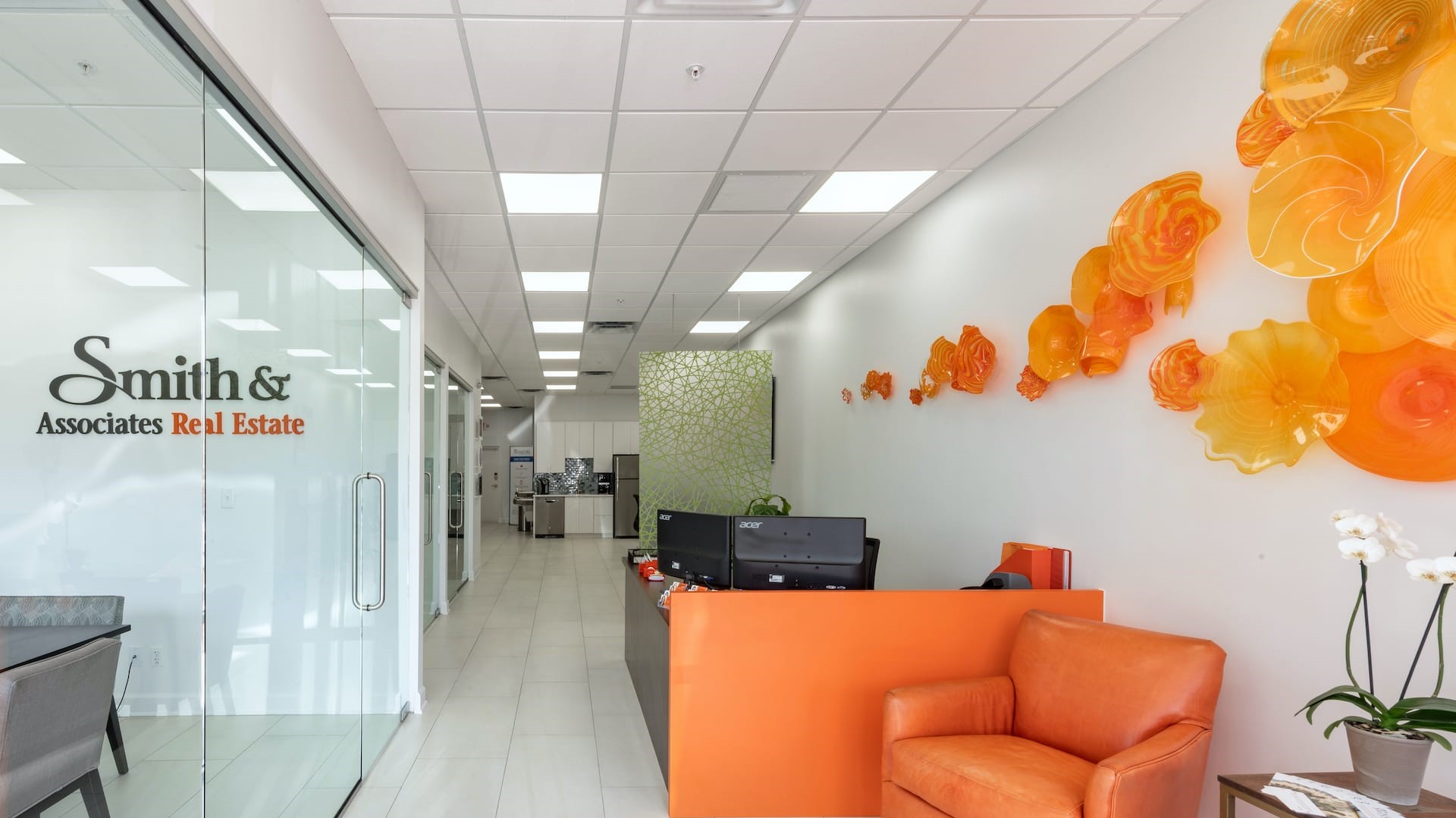 Smith & Associates Real Estate’s Westchase Office offers an exceptional location in the heart of Westchase. The office features a locally hand-blown Chihuly-inspired glass installation from the Morean Arts Center Glass Studio & Hot Shop. Walkable to other notable local businesses, Smith’s Westchase Office specializes in residential and commercial real estate in Hillsborough County and beyond.